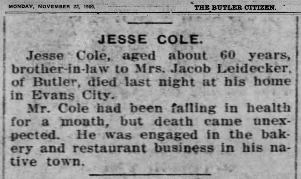 News about the passing of Jesse Cole In the Butler Citizen Mon November 22, 1909